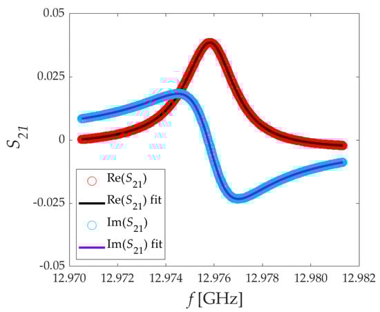 Figure 7. Resonance of the transmission scattering parameter S 21 . The measurements are fitted by means of a Lorentzian curve, as described in [24].