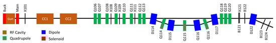 The FAST beam line (shown in Figure 1) starts with the gun, of similar type to the DESY-PITZ gun [10,11]. The 1054 nm output from a fiber laser is frequency-quadrupled and is shone onto a photocathode to produce photoelectrons [1,12], which are accelerated in the 1.3 GHz, 1.5-cell cavity. This is in turn followed by an emittance compensation solenoid, with adjustable position. The bucking solenoid directly upstream of the gun is generally set to produce a magnetic field in the opposite direction of the main solenoid at a magnitude such that the field at the photocathode is zero, so that the beam is born with zero angular momentum. The gun has an INFN-style load lock system [13] that allows for the exchange of photocathodes. Two TESLA cavities [14] (CC1 and CC2 in Figure 1) are used to accelerate the beam to 35–50 MeV in nominal cases. A series of quadrupoles are used to manipulate the beam transversely. The quadrupoles are followed by a chicane that is used to compress the beam. The chicane starts with D114 in Figure 1. The dipoles in the chicane are set to bend the beam , which gives a nominal of −0.18 m. The chicane can also be bypassed and the beam can be directed from Q113 to Q118, the start of a quadrupole triplet. Following B122, the beam energy can be measured on the beam dump line.
