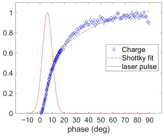 where is the photon energy and is the nominal work function of the photocathode. is the magnitude of the electric field, while is the RF phase. In practice, the constants can be lumped together with , the Schottky enhancement factor, in the fit. As such, the error function can be combined with the Schottky fit to yield for the initial laser pulse length a value of 8.6 ± 1.6 ps RMS, as shown in Figure 2, which is in fair agreement with the most recent photoinjector driver laser pulse configuration used at FAST.