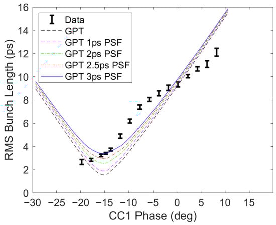 Measured RMS bunch length using CC1 phased off-crest and chicane for compression. Streak camera measurements are overlaid with GPT predictions convolved with a resolution term (PSF).