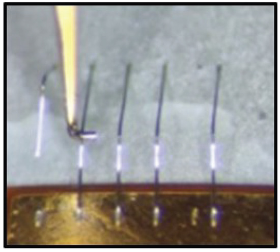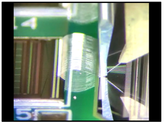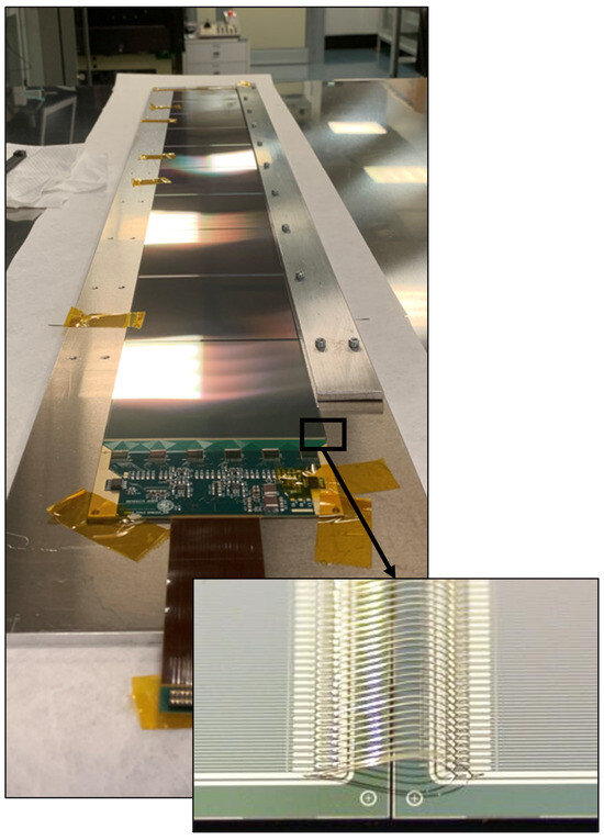 Figure 4 introduces the ladder and the wirebonds (on the left); i.e., the electric connections between adjacent tiles and between tiles and electronics. These tiny soldering junctions are how tiles are electrically connected to the read-out electronics (or front end). The “micro” nomenclature derives from the dimension of the wire used in the connection. The said dimension is contained by the distance between adjacent strips (each of which has to be connected to a single electronic channel), ranging from tens to hundreds of m. The touching of wires results in measurement failure. Therefore, the size of the wire used for the connections should be comparable to the strip pitch. The diameter of the aluminum wire used is 25 m, and a specific machine completes the attachment. Wirebonds are extremely fragile and break if touched or pulled. Thus, the silicon tiles and the front-end electronics are glued together on a substrate. The substrate exploits electrical duties by conducting the bias voltage from the electronics to the bottom of each detector. Hence, it is necessary to provide both a mechanical and electrical interface between the tiles/electronics and the substrate. In other words, the glue layer connecting the silicon and the PCB to the substrate should be at least partially conductive. Thus, a conductive and a structural glue must be employed to ensure electrical connection and adhesion.