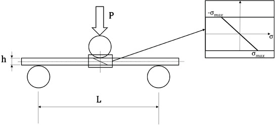 Concerning Figure 5, P and are the applied force and the resulting surface stress, respectively, h is the specimen thickness, b is the specimen’s width (through-the-paper dimension), and L is the free span (distance between supports), equal to 50 mm in the present case. Figure 6 portrays the test setup.