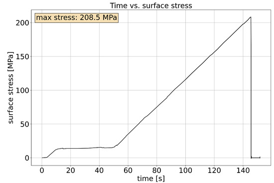 Starting from the rest position ( N), the equipment moved the central rod downwards and measured the force opposed by the system under test (SUT). The motion had an initial engagement phase, where the rod filled the gap between the resting position and the SUT surface. This was followed by a strain test, where the force applied by the moving gauge increased, compensating for the opposing force of the deforming specimen. Eventually, the sample broke, and the force applied by the gauge dropped to zero. Using Equation (1), the stress in the silicon sample was extracted from the measurement of the gauge and was plotted in the time–stress graph shown in Figure 7. The circumstance that the stress increased only linearly indicated that the silicon only deformed elastically until the breaking point. The stress at the breaking point for this sample was 208.5 MPa.