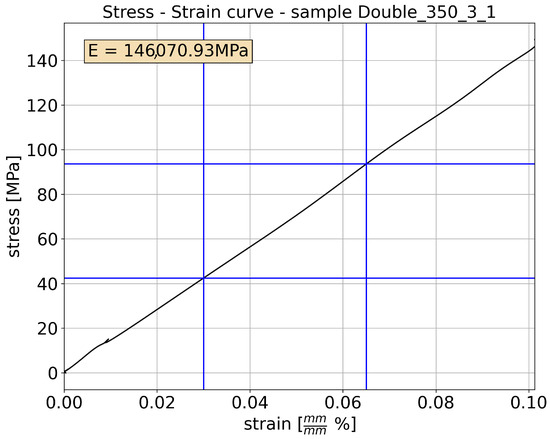Since can be computed from the applied force, it was necessary to measure to determine E. For this reason, mono-directional strain gauges were installed on eight out of the fourteen specimens. Of the former, three samples were tested to failure, with five in the elastic region, thus allowing multiple repetitions on the same specimen (to verify the repeatability of the measurement). Finally, the Young’s modulus was extracted from the strain–stress curves, like the one in Figure 8. The measured data are reported in Table 3.