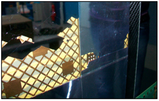 The reader can notice two different adhesive patterns: thin dark lines of epoxy structural glue (not to be mistaken with the bottom brown copper cross pattern) and gray dots of electrically conducting glue (necessary to ensure the system’s functionality).