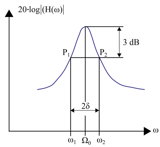 It is important to attest that high-damping has a very beneficial effect on non-static loads and especially on shock loads [24]. There are several ways to compute the damping, most of which are experimental (that is the reason why this study relied on experiments) [25,26]. In this case, the choice was the method the commonly called the 3 dB method. This method predicted the damping estimation from the frequency response function (FRF) peak amplitude drops [27,28]. Here, the damping of the first peak was considered (being associated with the flexural mode of the silicon tile). Thus, the damping value was a direct measure of how the glued interface filtered the inputs applied to the PCB (the adhesive was responsible for the load transfer between the PCB and the silicon). More information on the FRF is provided in the literature [29,30,31]. In the ideal case of undamped structures, the FRF amplitude at the peaks would be infinite (asymptotes in the function). In reality, all mechanical systems are damped and the FRF amplitude is finite. It can be proved that the damping is proportional to the peak width; narrower peaks have higher damping than wider ones. The 3 dB method was used to estimate the damping from the peak aperture. For this aim, Equation (4) was used, where is the peak frequency, and and are the frequency points to the left and right of the peak with an amplitude 3 dB less than that of the peak (Figure 12).