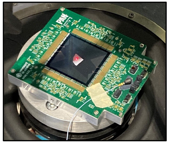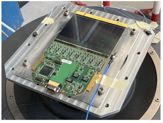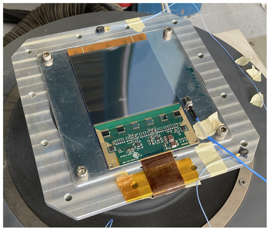 Test sample no. 2 was a tile and electronics functional assembly from the AMS-02 L0 upgrade. Figure 20 presents the SUT 2. The test started with two pairs of front-end chips (the external ones from each side) not connected to the silicon sensor surfaces. Similarly to test sample 1, the assembly was glued on a metallic plate, working as a test interface.