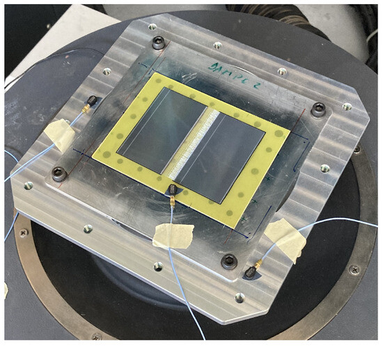 To produce general results not associated with specific configurations, three different test samples were selected. The first sample (Figure 19) comprised two AMS-02 DSSDs spaced 11 mm apart. It was not possible to electrically verify the object; thus, visual inspection was the only criterion available to judge the test results. The bond was intentionally longer for this campaign, to validate a sort of worst-case scenario. The detectors were glued on an FR-4 substrate and then on an aluminum plate (interface to the test apparatus).
