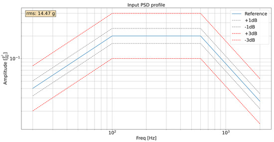The random test profile ranged from 20 Hz to 2000 Hz with a plateau between 100 Hz and 600 Hz and a ramping profile elsewhere (the same shape as the one presented in Figure 22). The profile is provided in terms of PSD, as in the cited standards [35,36,37]. The interested reader can find additional information on the topic in the literature [15,29].