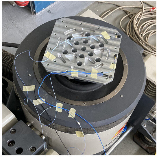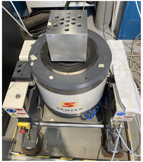 The severity of the random profile was measured through the root mean square (RMS) acceleration. All samples were tested at different levels (up to the maximum permitted by the apparatus i.e., 40 g RMS along the Z axis and 17 g RMS along X and Y) in the three directions. Concerning the equipment, the testing apparatus was the same Sentek L0315 shaker as in Section 3.3, with a different head expander for the X, Y, and Z tests. Figure 23 presents the X–Y test head expander, while Figure 24 presents that for Z.