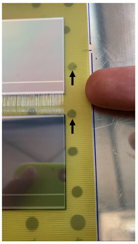 Starting with the involved adhesives, the epoxy glue used for this work was 3M scotch-weld epoxy adhesive 2216 gray, the Si-based was Dow Corning 3145 RTV MIL-A-46146 Gray, and the conductive glue was EPO-TEK® EJ2189. The glue was using a syringe. The deposition patterns were straight lines for structural glue (either Si or epoxy-based) and single dots for the conductive glue (as per Figure 10). The glue thickness was about m.
