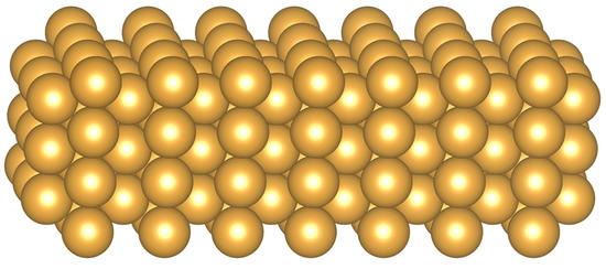 There are ongoing experimental and computational efforts to study laser field emission from Au-coated nanoblades, which are one-dimensional structures with a sharp edge used for plasmonic field enhancement [3,10]. Inspired by such efforts, we chose to study a face-centered cubic Au lattice with (100) surface orientation. We used the package JDFTx to implement all DFT calculations [11]. As shown in Figure 1, each Au (100) slab consisted of 15 layers of Au atoms, with each layer extending infinitely on a (100) lattice plane with periodic boundary conditions. The innermost 9 layers were fixed, while the outermost 3 layers on either side were optimized along the direction perpendicular to the surface to minimize the Gibbs free energy. JDFTx uses periodic boundary conditions in all directions, so an infinite array of Au (100) slabs was modeled. The periodic slab-to-slab spacing was equivalent to 26 layers such that the interaction between neighboring slabs was negligible [12]. The lattice constant of Au was fixed to 771 pm [13]. We considered both the ultrasoft GBRV pseudopotential (PP) [14] and the norm-conserving SG15 PP [15]. Although a norm-conserving PP generally provides more accurate results at the cost of computational efficiency, our calculation using the SG15 PP failed to converge. We therefore chose to continue with the GBRV PP. For electron exchange-correlation (XC) functionals, previous studies of similar systems have used the generalized gradient approximation (GGA) of the form Perdew–Wang 1991 (PW91) and Perdew–Burke–Ernzerhof (PBE) [12,16,17,18]. It turned out that the PBE XC functional resulted in a more reasonable Kohn–Sham (KS) PE profile (whose creation is described in Section 2.2) for our system, whereas the PW91 profile had a jump discontinuity and shot above the vacuum level before converging back (Figure 2). We therefore chose the PBE XC functional for all the following calculations. Our DFT calculation also used truncated Coulomb potentials [19], total energy minimization with auxiliary Hamiltonian [20], and smooth electrostatic potentials with atom-potential subtraction [21]. We performed a convergence test on the 12 × 12 × 1, 16 × 16 × 1, and 20 × 20 × 1 k-point grids, and we chose 20 × 20 × 1 for best convergence. Since the wavefunctions were expanded with a planewave basis, we performed an additional convergence test on the planewave energy cutoff, with the optimal value at 50 Hartrees (the atomic unit of energy, ).