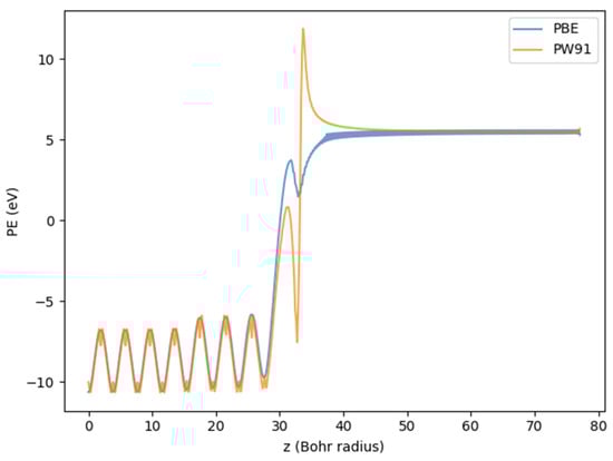 One-dimensional KS PE with a suboptimal k-point grid and a smaller planewave energy cutoff for the purpose of XC selection, using the PBE and PW91 XC functionals. The PE profiles are plotted along the normal direction through the surface, from the center of the slab to the center of the vacuum separating neighboring slabs. Periodic oscillations below 30 Bohr radii (the atomic unit of length, ) correspond to each layer of atoms inside the slab. Note that the PBE profile can be optimized by increasing the size of k-point grid and planewave energy cutoff and applying a Gaussian filter.