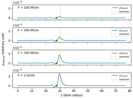 Longitudinal profiles of the induced electron density at fields of 100 MV/m, 300 MV/m, 700 MV/m, and 1 GV/m. The center of the slab is at 0 Bohr radii, and the solid green dot represents the position of the outermost atom, which is fixed for all the fields presented. The dashed orange lines show the centroid locations of the induced electron density, which are 30.40 Bohr radii (F = 100 MV/m), 30.49 Bohr radii (F = 300 MV/m), 30.34 Bohr radii (F = 700 MV/m), and 30.40 Bohr radii (F = 1 GV/m).