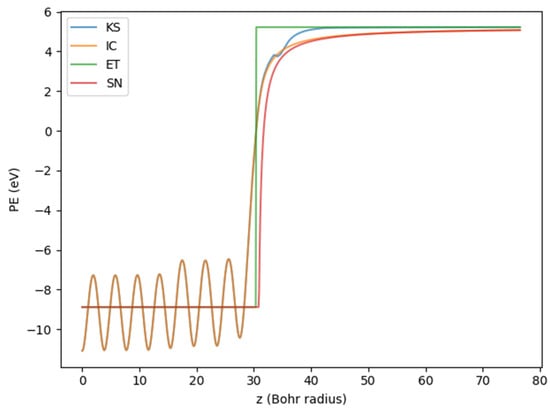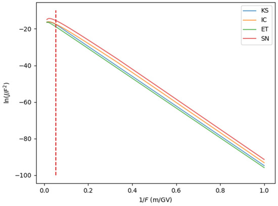 Finally, we present the emission current density as a function of the field, using the well-known Fowler–Nordheim plot (Figure 10). For an ET PE, the analytical solution on this plot is a straight line with a negative slope. Our results show this behavior for all four PEs, for fields below . The slopes of all curves are comparable in this region, so our new PEs (KS and IC) would not account for the experimentally deduced field enhancement factor that tends to increase these slopes [29]. For fields greater than , all four curves are concave down, indicating that the emission current densities are smaller than expected. This is most likely due to the overprediction by the first-order Taylor expansion in the FN framework (Figure 9). Again, the results for fields above are not easily applicable to ES field emission, but they may be useful as a quasi-static approximation to laser-induced field emission.