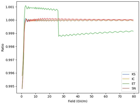 To obtain the transmission coefficient, we wanted to solve the one-dimensional TISE for any discretized PE to obtain the full wavefunction. While the TM method is tailored to this problem, there are many numerical techniques to solve general initial value problems for ordinary differential equations. We first performed cubic spline interpolation to obtain a continuous PE. Then, we discretized it on increasingly finer grids to test the convergence of such methods. It turned out that the TM method and the explicit Runge–Kutta method of order 8 (DOP853) [25] had the best accuracy. We examined the ratio of transmission coefficients from the two methods from 500 MV/m to 80 GV/m (Figure 5). The discrepancy was larger at smaller fields, presumably because of numerical errors inherent in extremely small transmission coefficients. The larger discrepancy for the ET PE might have been caused by its jump discontinuity. Even then, with a sufficiently small step size, the results of the two methods deviated by less than 1% overall. This indicated that both the TM method and DOP853 produced accurate, replicable results for this problem. For computational efficiency, we used the TM method for the following computations.