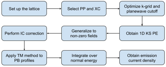 To summarize, we first set up a DFT calculation with an Au (100) lattice and selected the appropriate PP and XC functional for this system. The size of the k-point grid and planewave energy cutoff were both determined with convergence tests. This DFT calculation returned a 3D KS PE, so we needed to convert it to 1D for more straightforward solutions. Next, we calculated the KS PE as a function of the field by determining the location of the electrical surface. An IC correction was performed to build a smooth PE profile. To find the transmission coefficient accurately, we chose the TM method. Then, we integrated the transmission coefficient over energy space to obtain the emission current density as a function of the applied field. This procedure is illustrated in Figure 6.