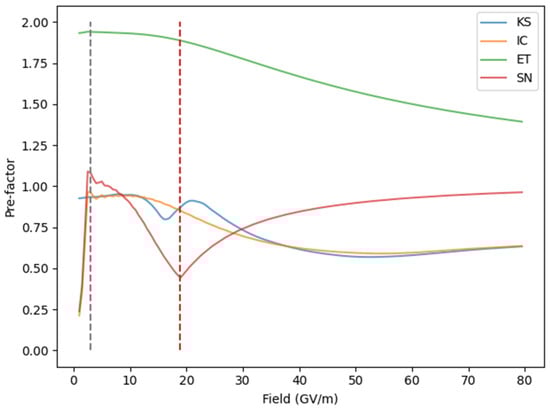 Figure 8 presents this pre-factor obtained from the TM method. In the low-field limit, the pre-factor for the ET PE is close to 2, a result consistent with the existing literature [27,28]. The pre-factor for SN is numerically unstable for fields up to 3 GV/m, but for higher fields, it shows a V-shaped curve with the cusp at the reference field . This cusp is the result of taking the WKB transmission coefficient to be 1 in the electron “flyover” regime. The V-shaped curve for SN is qualitatively consistent with that of Mayer. Although he presented the pre-factor with increasing electron normal energy, the effect is similar to increasing the field—both methods reduce the height of the PE barrier that an electron sees. Both the KS and IC PEs have comparable pre-factors, which are close to 1 for fields smaller than 10 GV/m but decrease for fields greater than . As pointed out by Forbes, the pre-factor is close to unity for “ideally smooth” PE profiles [7]. The low-field behavior of KS and IC pre-factors is therefore likely due to the “ideally smooth” shape of their PE profiles, in contrast to the jump discontinuity in the ET profile or the steep slope of the SN profile. Due to the “bump” in the KS PE profile, its pre-factor deviates from unity faster than the IC pre-factor. For fields greater than , all the pre-factors quickly depart from their low-field behaviors, indicating the breakdown of the Landau and Lifschitz formula at high fields. In summary, our results confirm the necessity of the pre-factor for the ET and SN PEs at fields below , while indicating departure from the Landau and Lifschitz formula at higher fields.