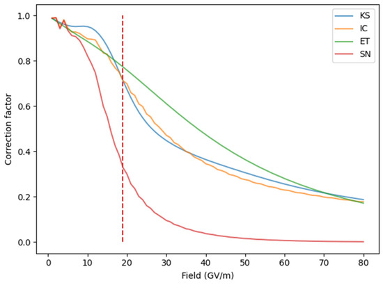 Correction factor arising from the first-order Taylor expansion. The dashed red line at 18.92 GV/m represents the reference field for the SN PE.