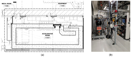 (a) Drawing of radiation bunker depicting klystron gallery and accelerator housing; (b) photo of klystron gallery with first 25 MW XK-5 and modulator installed.