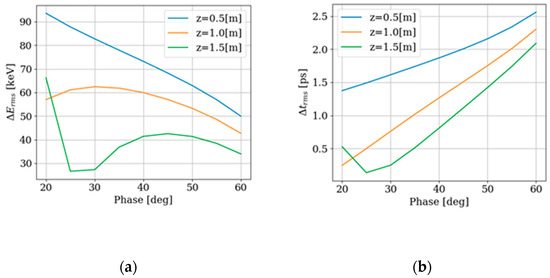 (a) Effects on energy spread; (b) bunch length at different z-locations along beamline versus injection phase. The design location for the entrance to the linac is 1.5 m (green).