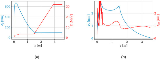 (a) Beam evolution of bunch length and energy to end of 1.5 m linac and, similarly, (b) transverse size and emittance. Injection into the linac occurs at 1.5 m.
