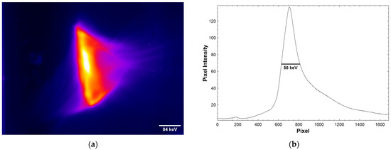(a) Image of the 250-pC electron beam on the spectrometer screen after the 45° bend. The central energy is ~4.2 MeV; (b) profile of beam energy and FWHM energy spread.
