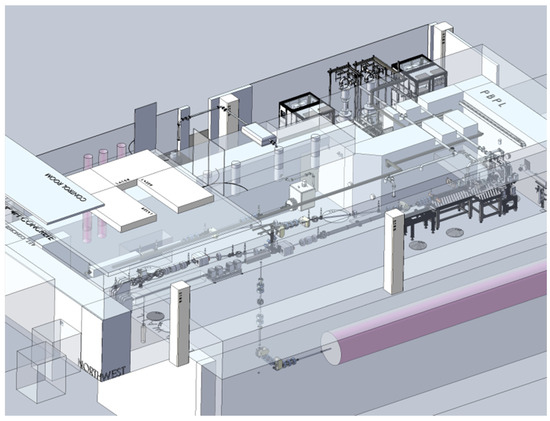 Three-dimensional CAD rendering of the planned 80 MeV beamline(s), including a 30 MeV dogleg and vertical bend into the Large Plasma Device bunker.