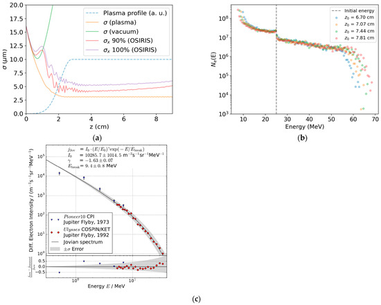(a) Transverse evolution of beam in plasma, where σx accounts for head erosion; (b) electron spectrum after traversing the plasma capillary. Dotted black line indicates the initial electron beam energy; (c) Jovian electron spectrum [12].