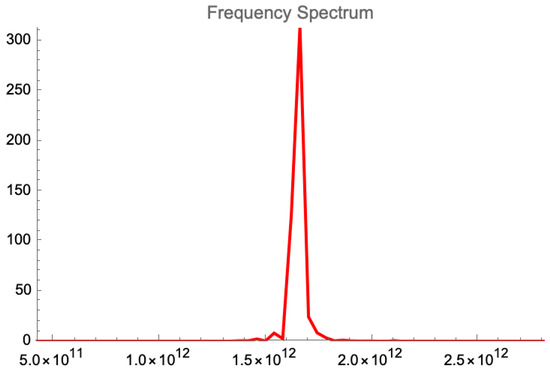 Spectrum of coherent Cerenkov radiation produced by the electron beam in a dielectric-lined waveguide. The central frequency is 1.66 THz with a bandwidth of 100 GHz.