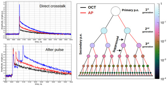 - The probability of direct optical cross-talk (OCT) and after-pulse (AP) as a function of the SiPM over-voltage;