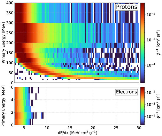 To use the Bayesian deconvolution algorithm, an incoming spectrum () is related to the measured spectrum () in a so-called “response matrix”. Since previous works [42,43] have demonstrated the sensitivity of the measurement to incident proton kinetic energy, we have chosen a response matrix relating the spectra to an incoming monoenergetic omnidirectional electron or proton field (Figure 3). For each detected track, the stopping power was calculated as: