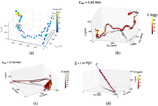 Event displays of 3D reconstructions of tracks: (a) 120 GeV/c pion passing through a 500 µm thick silicon sensor; (b,c) high-energy electron and fragmentation reaction measured during exposure of a 2 mm thick CdTe sensor to a 180 GeV/c pion beam; (d) cosmic muon with a 3D line fit. Fitting the trajectory allows for a trajectory reconstruction with precision of <200 µm evaluated at a distance of 1 m. Reproduced from [23,24] (CC BY 4.0, no changes were made).