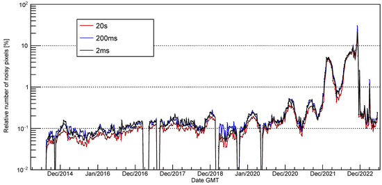 This procedure was done for every consecutive week from the beginning of available data in August 2014 until the 30 June 2023. Furthermore, this analysis was performed separately for the three different acquisition times. Naturally, more pixels will have sent a signal in longer frames than in shorter ones, which could have skewed the distributions. The resulting relative numbers of noisy pixels are shown in Figure 5.