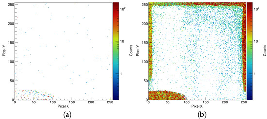 - Timepix was developed within the Medipix2 collaboration [32]. It segments the sensor into a square matrix of 256 × 256 pixels with a pixel pitch of 55 µm and purely relies on a frame-based readout scheme (dead-time > 11 ms). Each of the 65,536 pixels can be set to either of the three modes of signal processing: time-over-threshold (ToT), time-of-arrival (ToA, resolution > 10 ns), and hit counting.