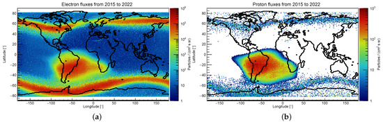 Figure 8a,b show the fluxes of electrons and protons classified with the method described in Section 2.3. The majority of particles present in the radiation environment in LEO were protons (up to 400 MeV) and electrons (up to 7 MeV) that were trapped by the Earth’s magnetic field. For electrons, three distinct structures are discernible, i.e., the northern polar horn, the southern polar horn, and the South Atlantic Anomaly (SAA). The northern and southern polar horns correspond to the points at which the satellite passed through the Earth’s outer radiation belt. The SAA is present due to the satellite crossing the Earth’s inner radiation belt. This crossing is possible due to the incline of the Earth’s magnetic dipole combined with the deviation of the Earth’s magnetic center with respect to the Earth’s center of mass. While the outer radiation belt consists of electrons, the SAA is the only area in SATRAM’s orbit, where a non-negligible flux of protons should be present. Thus, protons seen in the polar horns (in Figure 8b) were interpreted as misclassified electrons.