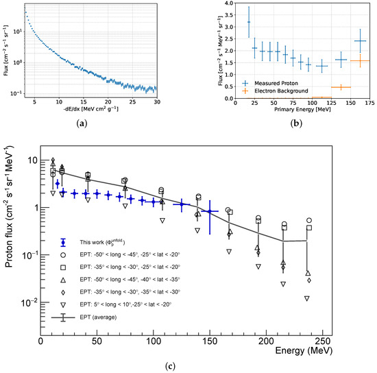 (a) spectrum measured in the SAA used as input for the unfolding methodology. (b) Results of the unfolding methodology described in Section 2.4 for the spectrum of (a) (blue line). The electron contribution determined in simulation (orange line, see text for details). (c) The energy-dispersive differential proton flux after electron background subtraction (blue markers). The SATRAM data measured within the SAA bin (longitude , latitute ) are compared with a previous analysis of the EPT team [47] measuring at different geographic locations (different markers). The solid line resembles the average of these measurement points. Since the errors for the different locations are the same, these are drawn representatively for the averaged flux for improved visualization.