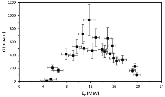 76Se(p,n)76Br, 76Se(d,2n)76Br, 75As(3He,2n)76Se, and 75As(4He,3n)76Se are examples of cyclotron-based pathways for the production of 76Br [25,26,27,28,29]. Of these, only 76Se(p,n)76Br is a possible reaction within the specification of the cyclotron used (iba Cyclone 18/9). The energy-dependent cross section for the reaction is shown in Figure 1. The maximum of the cross section is obtained at a proton energy of Ep ~ 13 MeV.