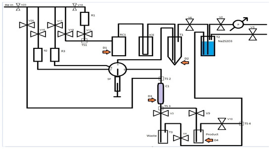 Scheme of the system used for thermochromatographic distillation (V1–V23: valves, RC1: reactor 1—quartz glass apparatus with tube furnace, ICE: cooling trap, T1: trap 1–5 mL water, SP: syringe pump, C1: QMA-cartridge, Product: product vial, T2: trap (saturated sodium thiosulfate solution), T3: waste, P: vacuum pump, R1, R2, R3: reservoirs, TS: T-connectors, D1–D4: radioactivity detectors).