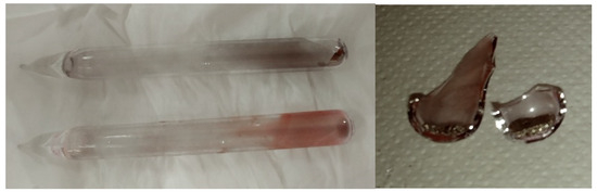 Evacuated quartz glass ampules containing CoSe after heating in the furnace at 1200 °C for 60 min. Left: Closed ampule—silvery shining amorphous deposits together with grayish or reddish remains at the inner surface of the quartz glass ampule. Right: opened ampule—porous and brittle CoSe is strongly sticking to the quartz surface.