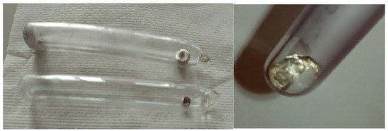 The production of [76Se]CoSe by mixing elemental cobalt and elemental 76Se stoichiometrically and heating up to 1200 °C in an evacuated quartz glass ampule for 60 min was tested with the natSe compound. We observed silvery shining amorphous deposits sticking to the quartz glass surface up to loose metallic glassy nuggets (Figure 3 and Figure 4). This came along with grayish or reddish remains deposited at the inner surface of the quartz glass ampule indicating the formation of amorphous and polymorphous selenium species. Incomplete chemical reaction and the presence of oxygen are likely reasons. A key factor for improvement was a careful vacuum melting of the quartz glass ampule and thereby retaining the vacuum.