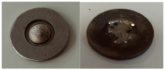 The formed [76Se]CoSe was removed from the ampule and pressed under argon atmosphere at 1075 °C in a cavity (Ø = 12 mm, h = 1 mm) of a niobium disc (Ø = 24 mm, h = 2 mm) (Nb foil, thickness 2 mm, purity 99.8%, Alfa Aesar, Kandel, Germany) (Figure 5). 230 mg [76Se]CoSe would have resulted in a ~ 26 µm homogeneous coating of the Nb cavity, assuming perfect pressing procedure. However, the cavity of the niobium disc was not entirely filled with [76Se]CoSe after hot pressing. A more complete cover of the cavity could be achieved by an increase of [76Se]CoSe starting material or further thorough repetitions of the pressing process. However, this would risk further loss of [76Se]CoSe by splattering out of the cavity during the pressing procedure. We refrained from further optimization of the hot pressing, because the imperfect coverage of the cavity was neglectable for the intended 76Br production.
