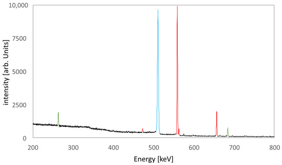 γ-spectrum section of an irradiated target disc. Identified radio nuclides are 76Br (red) and 93mMo (green) (blue: 511 keV annihilation radiation).