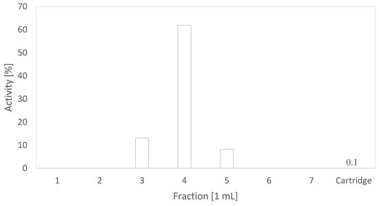 Non-radioactive 10 µM Br− solution and 250 µM–20 mM Cl− solution were used together with ion chromatography (ICS-1600, Dionex GmbH, Idstein, Germany) to determine the minimal required Cl− concentration for the quantitative extraction of 76Br. Only the 20 mM Cl− solution allowed a quantitative extraction of 76Br. Figure 7 shows the elution of 76Br with 20 mM Cl− solution. 76Br was found in samples 3–5 of the collected 1 mL fractions. Less than 0.1% of 76Br remained at the cartridge.