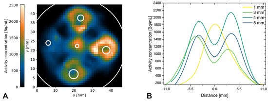 (A) Projected activity of the PET-phantom. The outlines of the phantom and its bore holes are outlined in white. (B) Line profiles across the bore holes.
