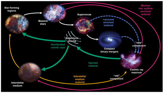 - Lingenfelter, R.E. The Origin of Cosmic Rays: How Their Composition Defines Their Sources and Sites and the Processes of Their Mixing, Injection, and Acceleration. Astrophys. J. Suppl. Ser. 2019, 245, 30. [Google Scholar] [CrossRef]