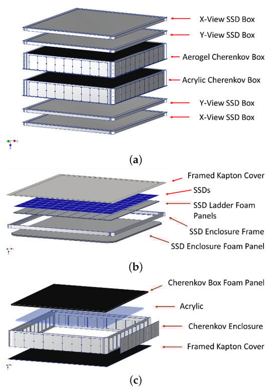 (a) Expanded view of the standard TIGERISS payload technical model. (b) SSD expanded view. (c) Acrylic Cherenkov detector expanded view.