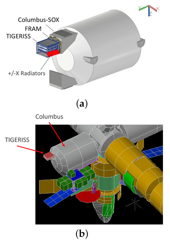 (a) Columbus SOX TIGERISS payload technical model showing radiators. (b) Columbus SOX TIGERISS payload thermal model.