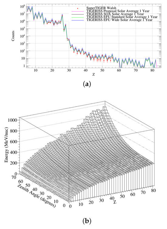 (a) Predicted abundances measured by TIGERISS after one year of operation [6] compared to those measured by SuperTIGER over its first 55-day long-duration balloon flight [1,2,3,4]. (b) Incident threshold energy (MeV/amu) required to trigger TIGERISS as a function of Z and zenith angle () [6].
