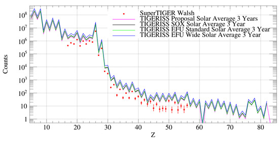 TIGERISS GCR statistics for ISS observations have been generated for the new instrument models under study [6]. Figure 7a gives predicted one-year TIGERISS measurements for the proposed JEM-EF model (pink), Columbus SOX model (black), current JEM-EF standard model (green), and JEM-EF wide model (blue) configurations [6] compared with those from the first SuperTIGER flight (red) [1,2,3,4]. The expected TIGERISS one-year statistics are comparable to or better than those for SuperTIGER where their sensitive ranges overlap.